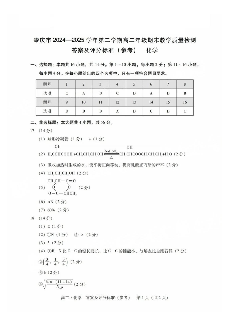 广东省肇庆市2024-2025学年高二下学期期末考试化学答案