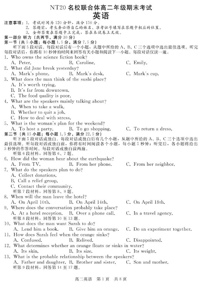 高二英语+答案(河北省NT20名校联合体2024-2025学年高二下学期7月期末)
