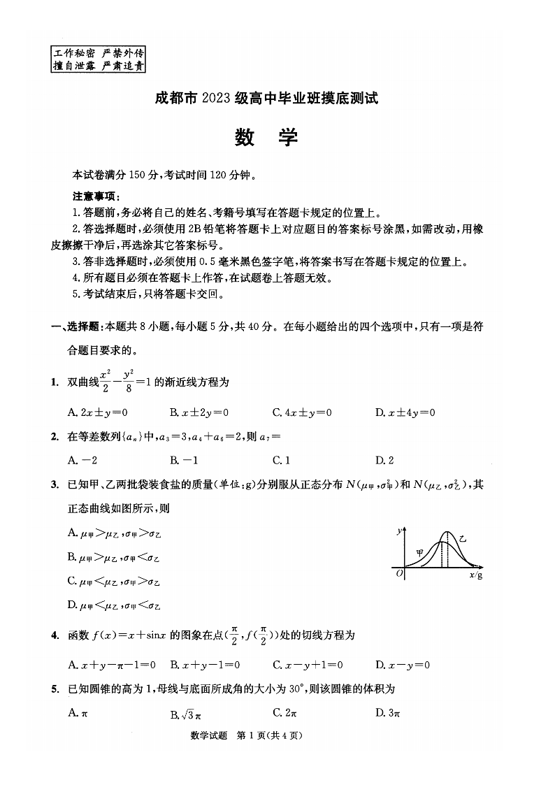 高二数学--四川省成都市2023级高中毕业班摸底测试(成都零诊)