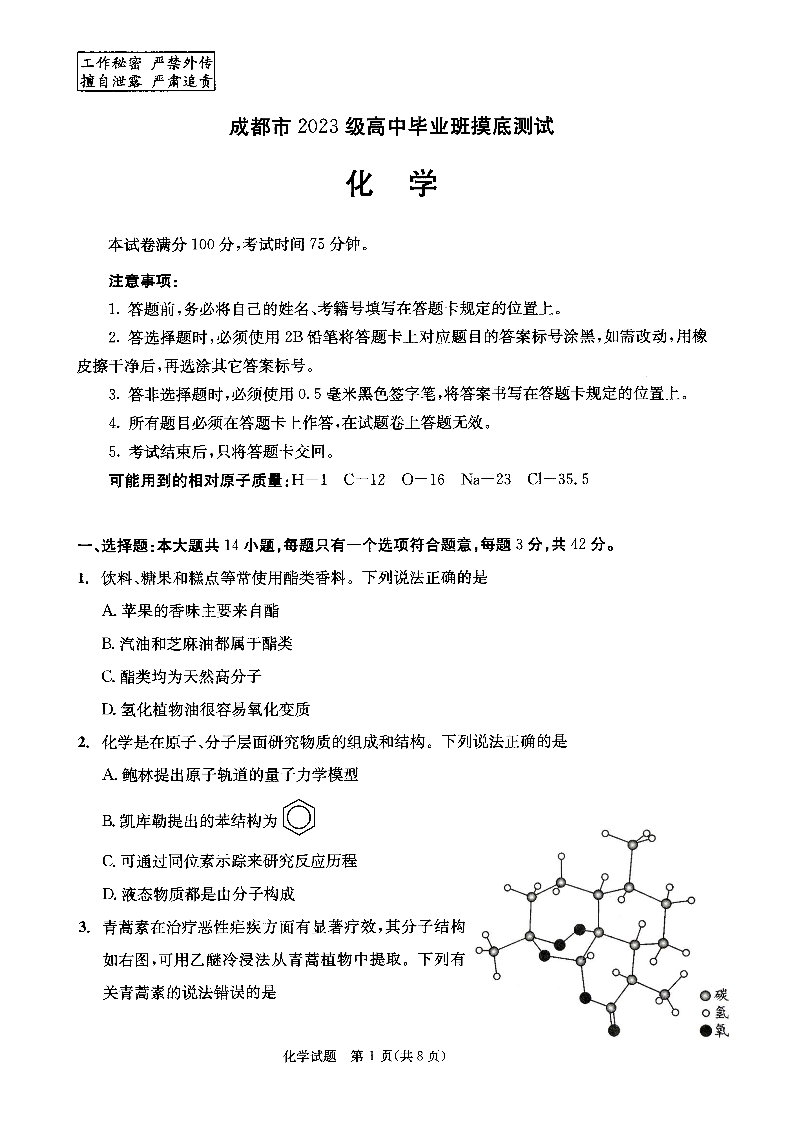 高二化学--四川省成都市2023级高中毕业班摸底测试(成都零诊)