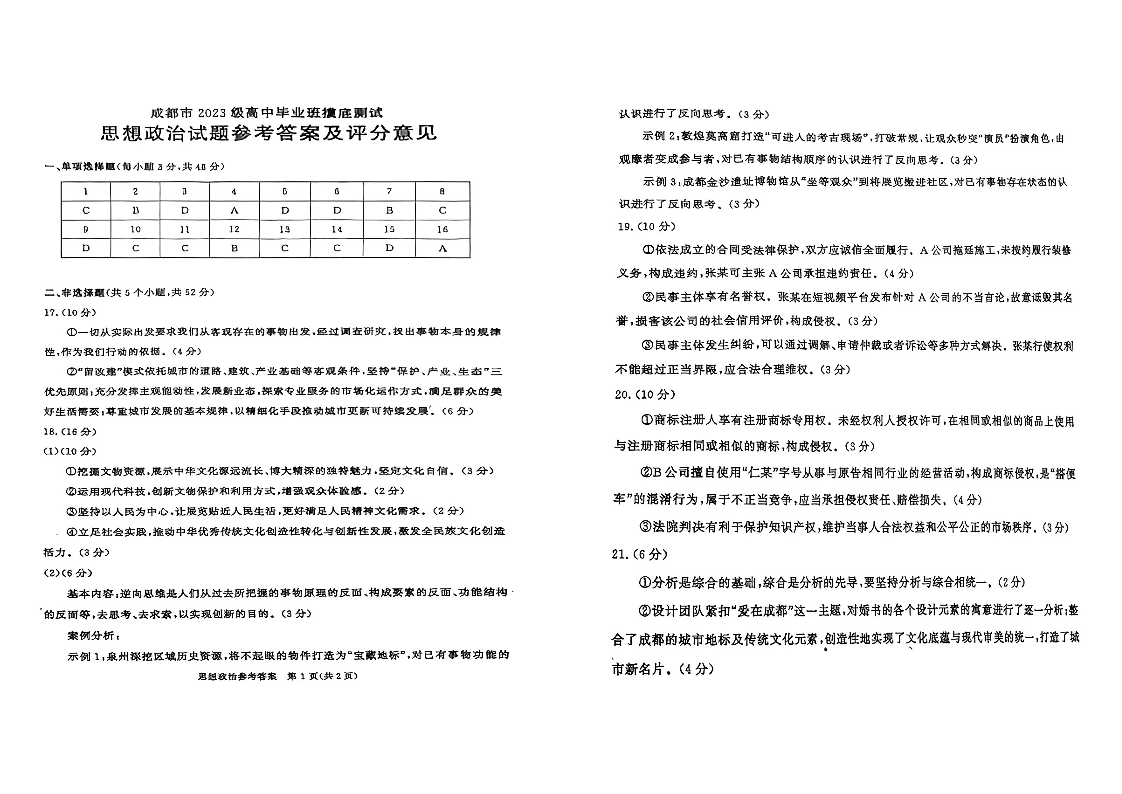 高二政治答案--四川省成都市2023级高中毕业班摸底测试(成都零诊)
