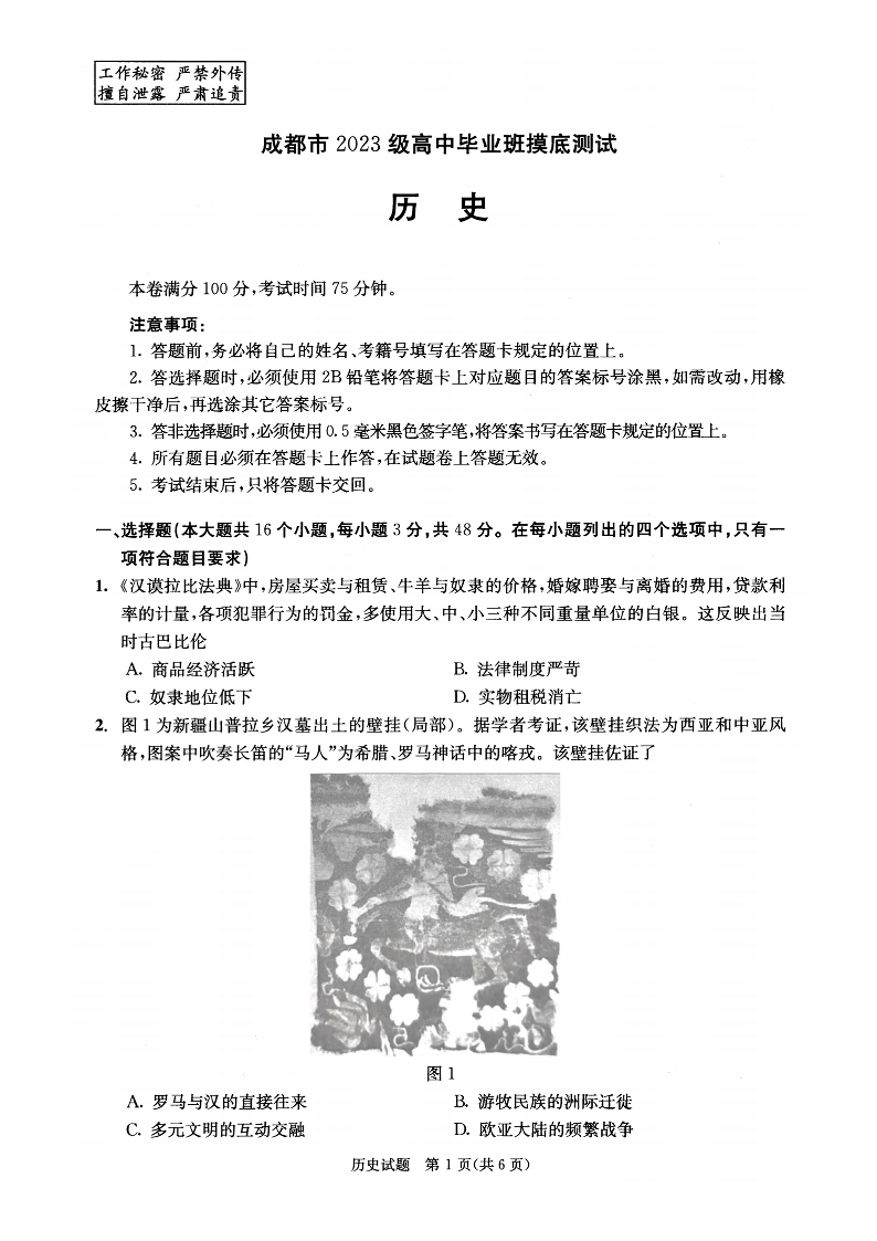高二历史--四川省成都市2023级高中毕业班摸底测试(成都零诊)