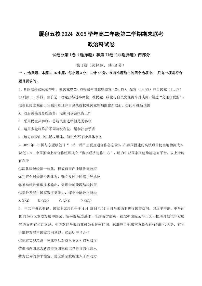 高二政治+答案--福建省厦泉五校2024-2025学年高二下学期期末联考