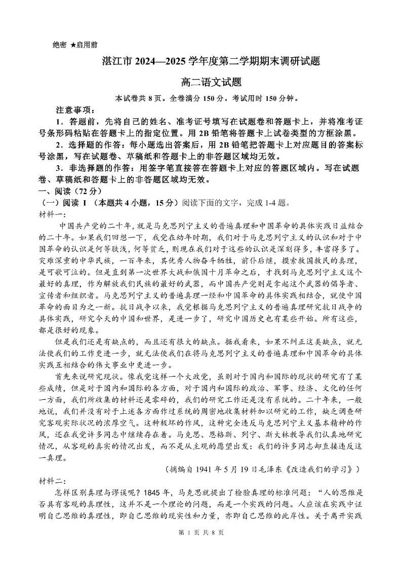 高二语文--广东省湛江市2024-2025学年高二下学期期末调研测试考试