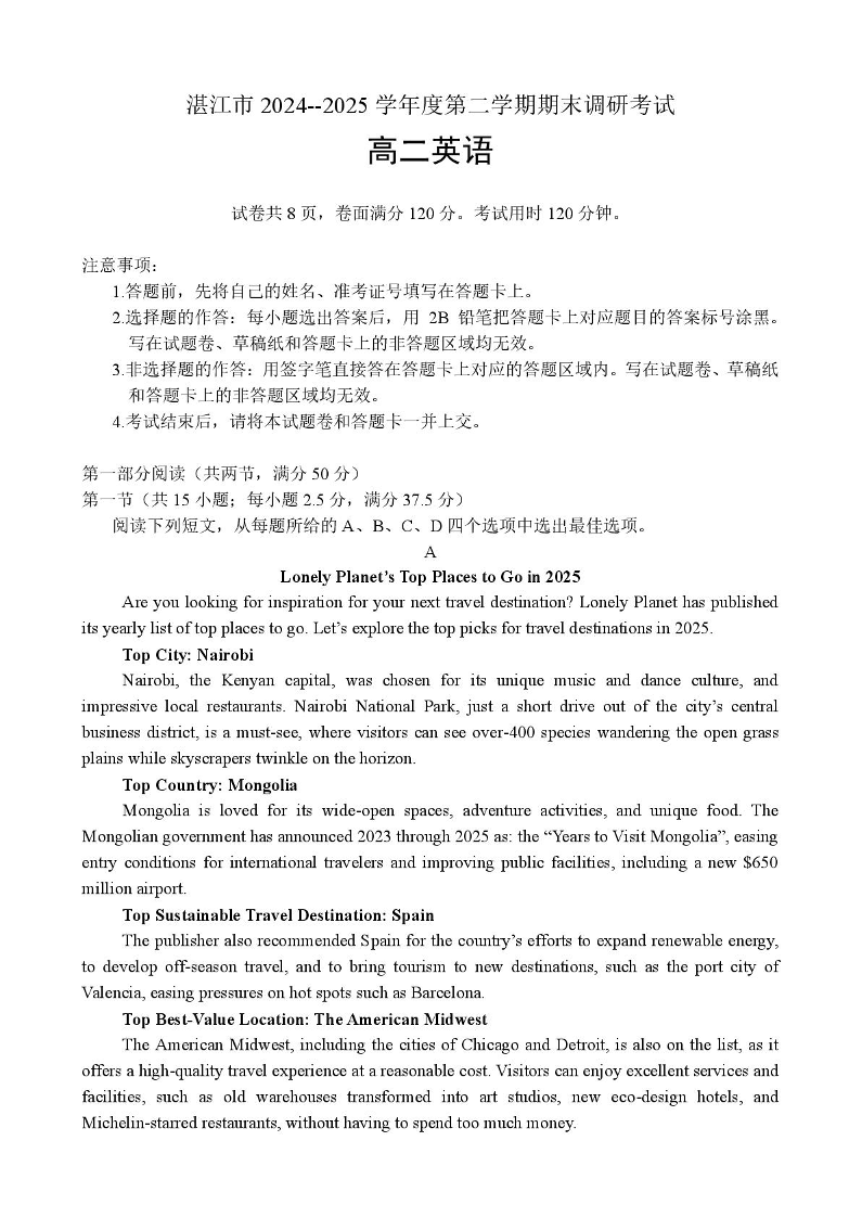 高二英语+答案--广东省湛江市2024-2025学年高二下学期期末调研测试考试