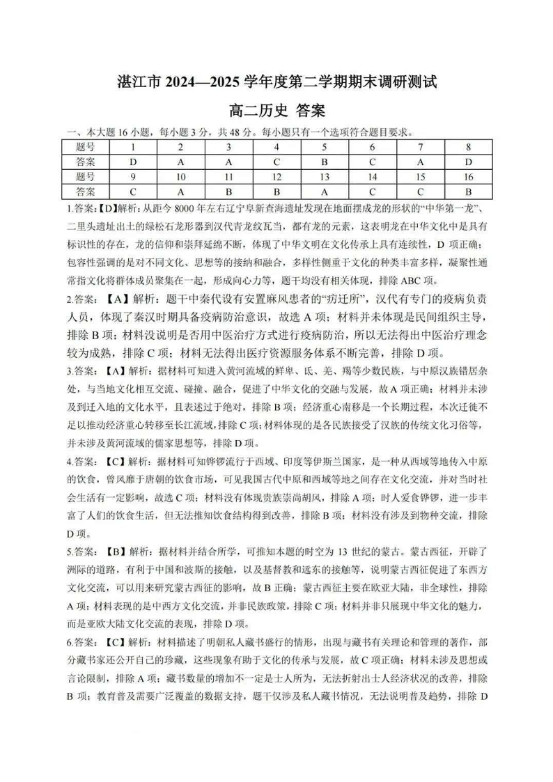 高二历史答案--广东省湛江市2024-2025学年高二下学期期末调研测试考试