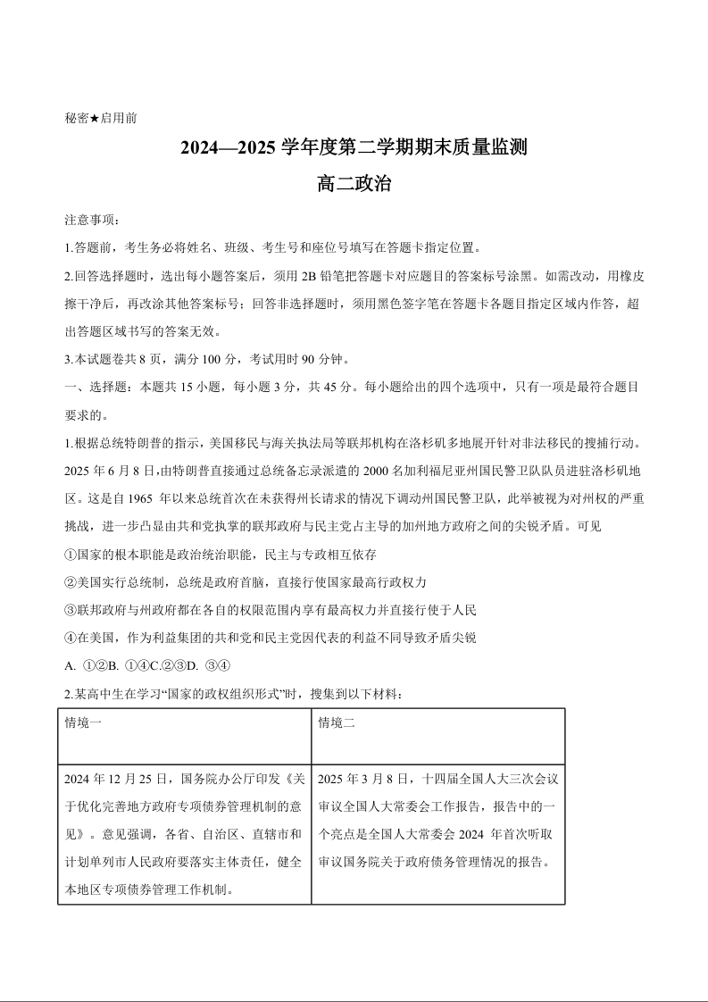 高二政治+答案--山东省东营市2024-2025学年高二下学期期末质量监测