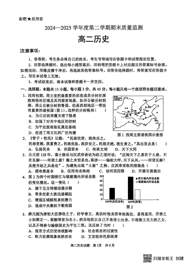 高二历史+答案--山东省东营市2024-2025学年高二下学期期末质量监测