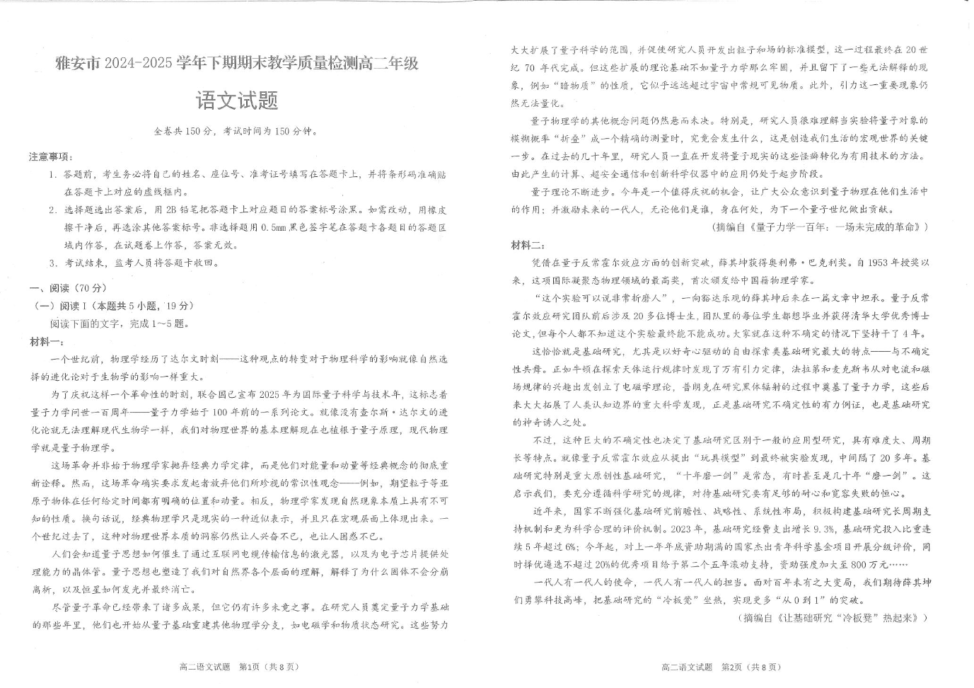 高二语文--四川省雅安市2024-2025学年高二下学期期末教学质量检测试卷