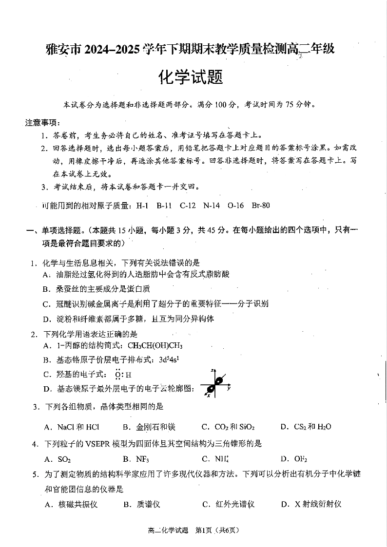 高二化学+答案--四川省雅安市2024-2025学年高二下学期期末教学质量检测试卷