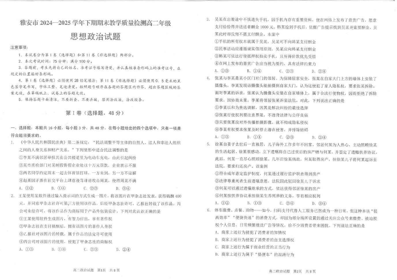 高二政治+答案--四川省雅安市2024-2025学年高二下学期期末教学质量检测试卷