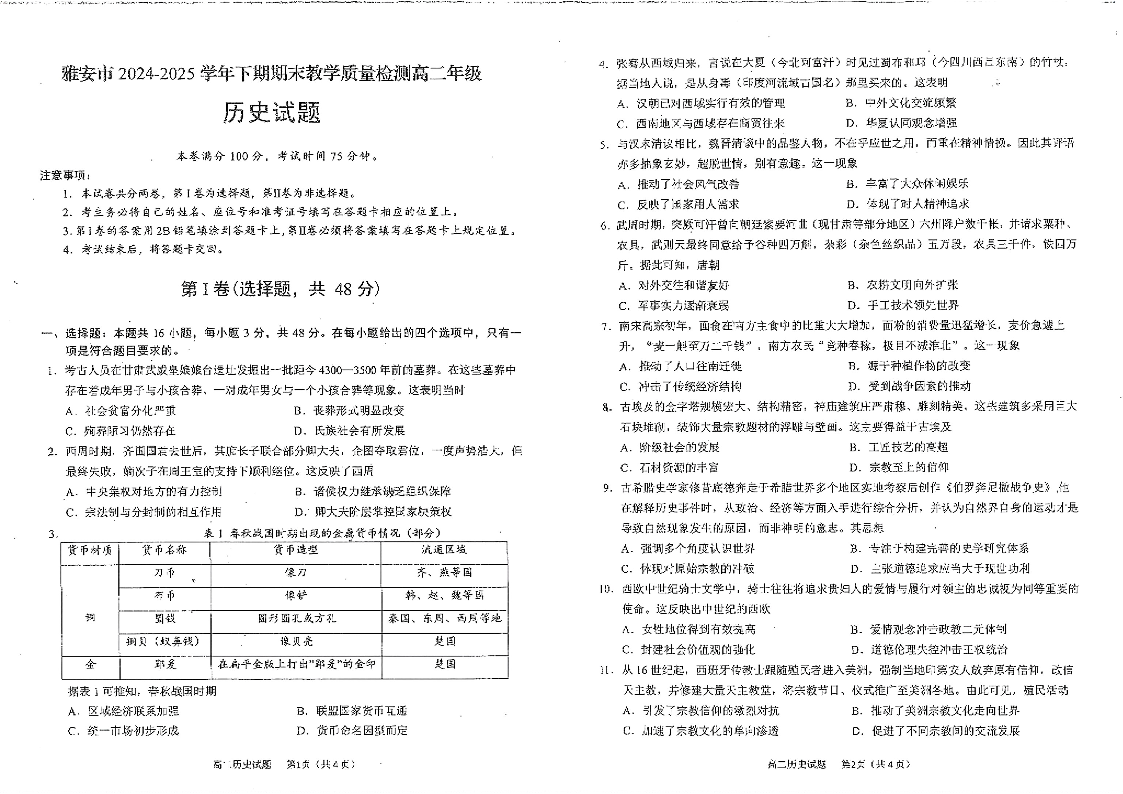 高二历史+答案--四川省雅安市2024-2025学年高二下学期期末教学质量检测试卷