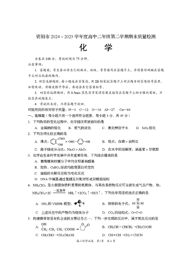 高二化学+答案--四川省资阳市2024-2025学年高二下学期期末质量监测