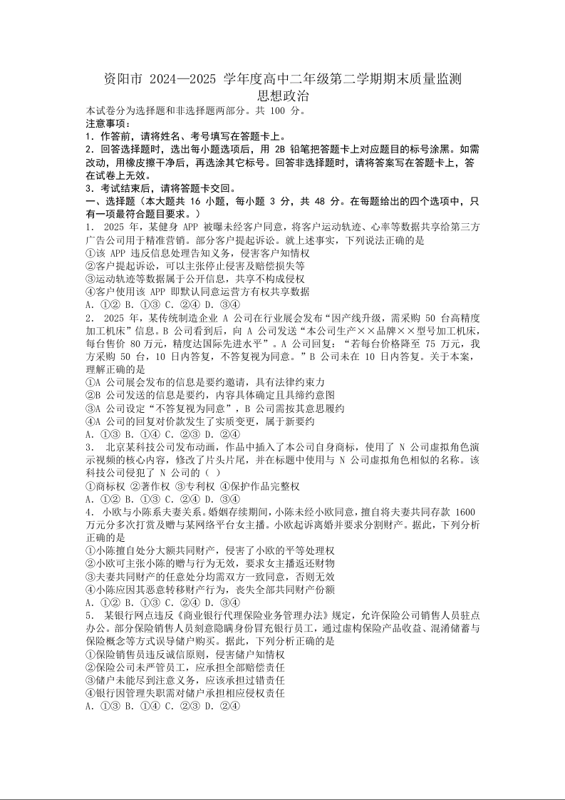 高二政治+答案--四川省资阳市2024-2025学年高二下学期期末质量监测