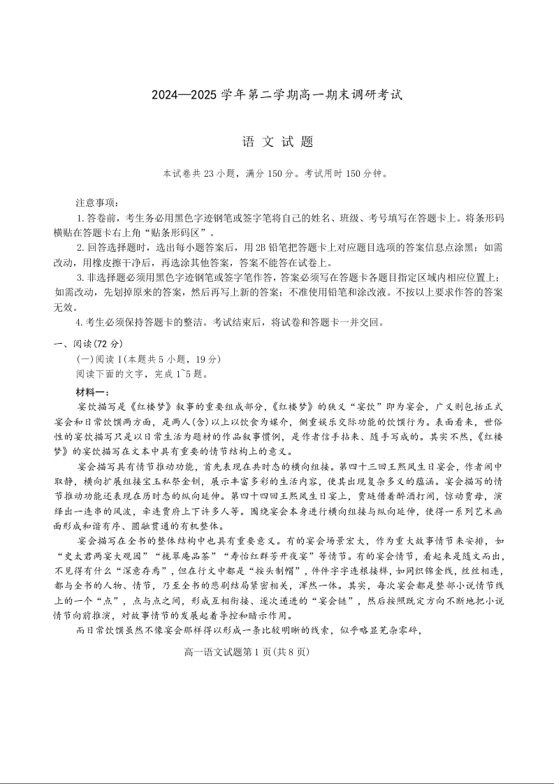 高一语文+答案--河北省保定市2024-2025学年高一下学期7月期末调研