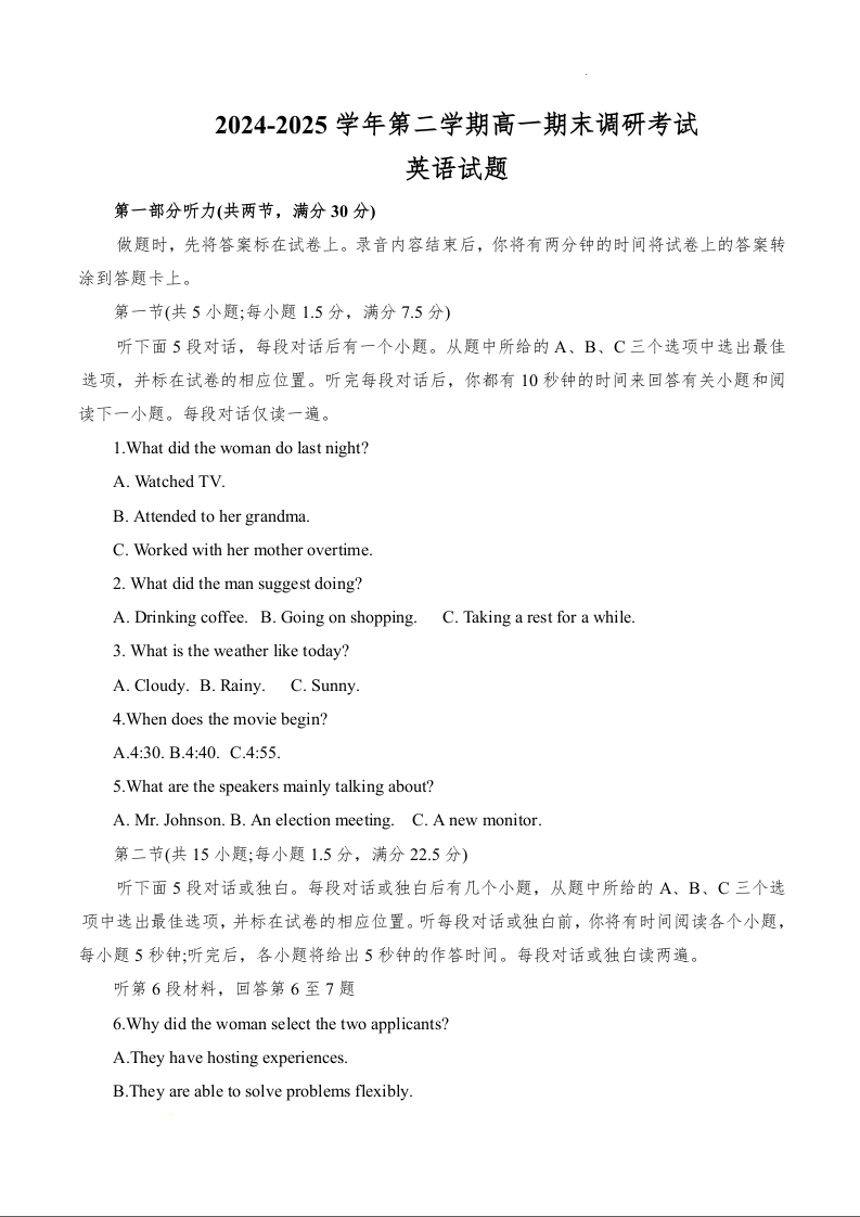 高一英语--河北省保定市2024-2025学年高一下学期7月期末调研