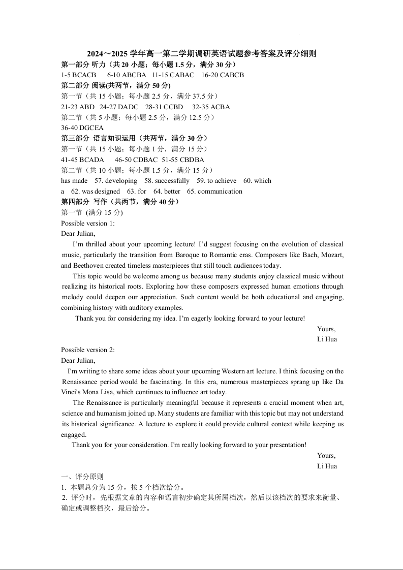 高一英语答案--河北省保定市2024-2025学年高一下学期7月期末调研