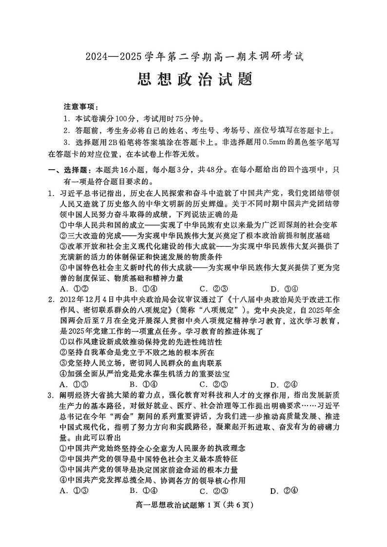 高一政治--河北省保定市2024-2025学年高一下学期7月期末调研
