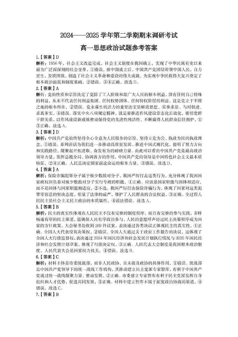 高一政治答案--河北省保定市2024-2025学年高一下学期7月期末调研