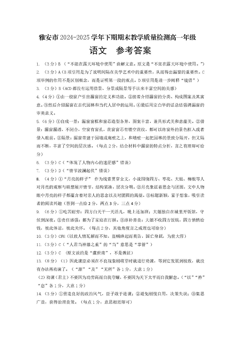 高一语文答案--四川省雅安市2024-2025学年高一下学期期末教学质量检测试卷
