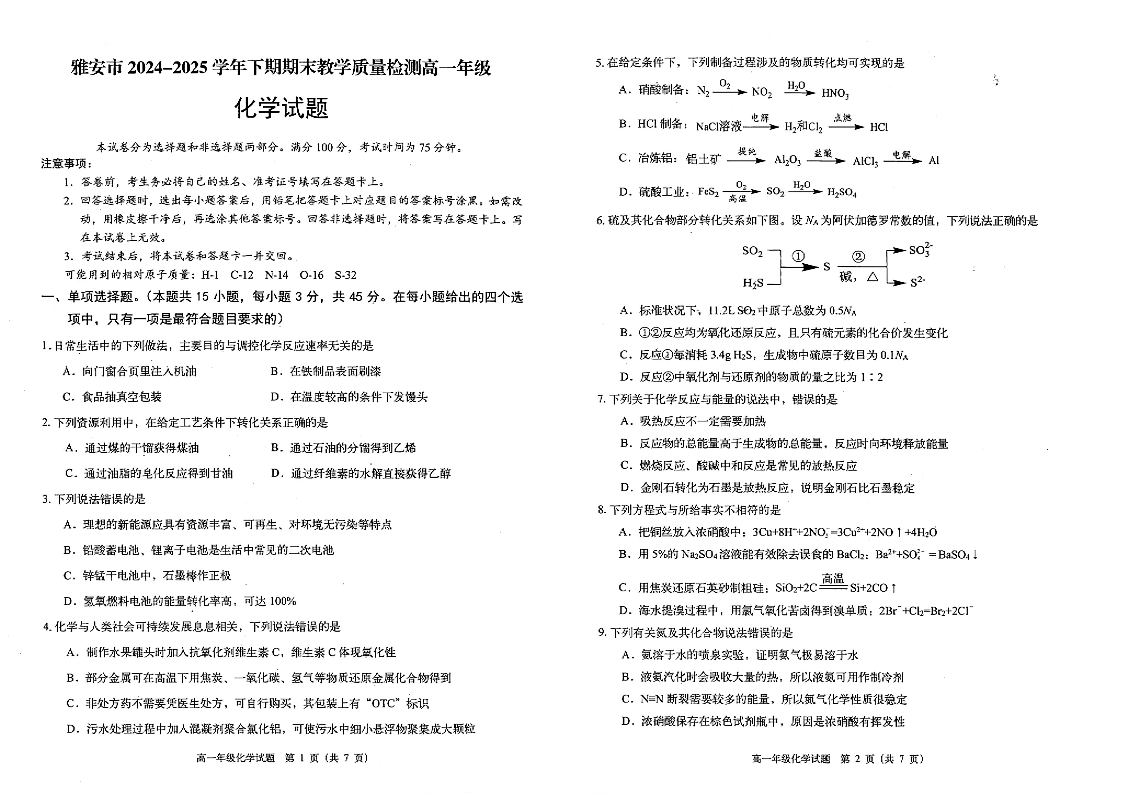 高一化学+答案--四川省雅安市2024-2025学年高一下学期期末教学质量检测试卷