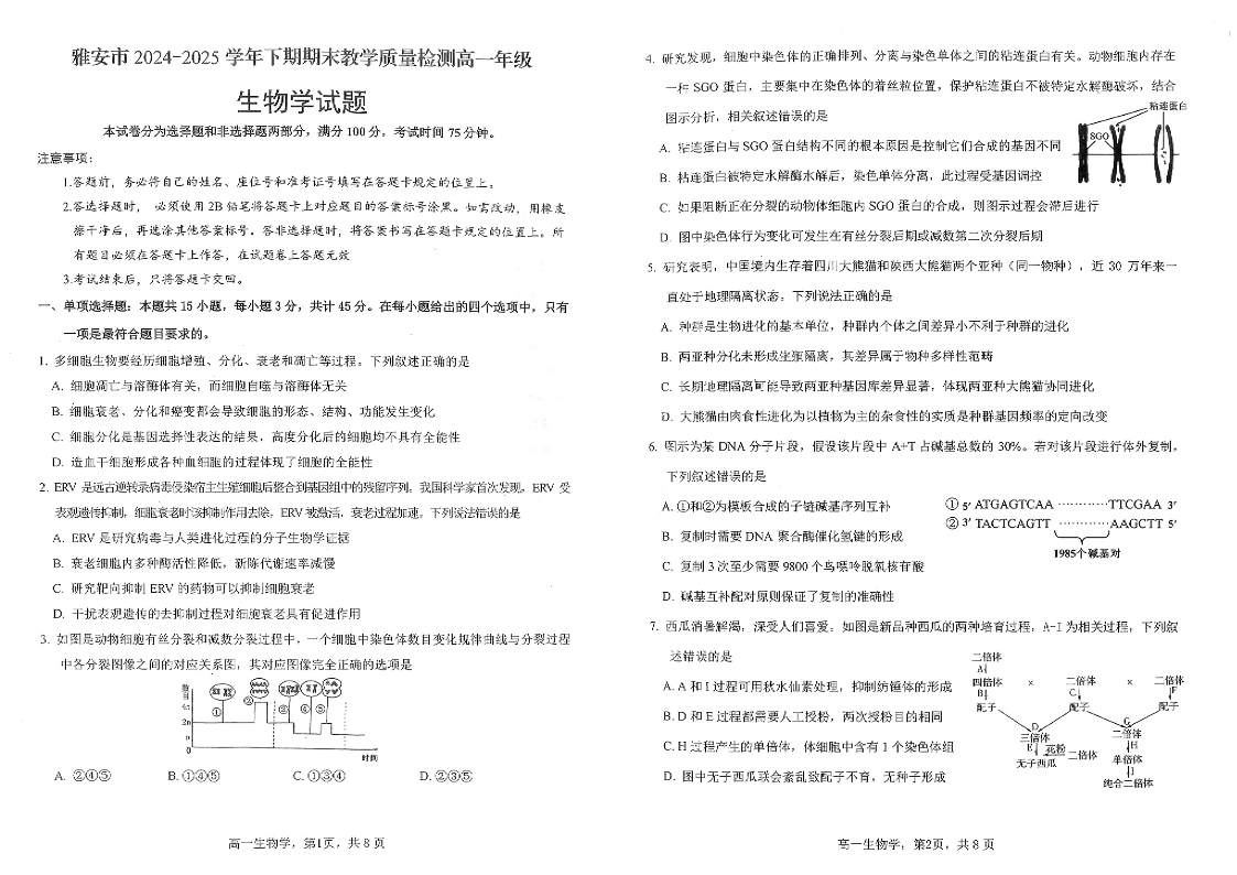 高一生物+答案--四川省雅安市2024-2025学年高一下学期期末教学质量检测生物试卷