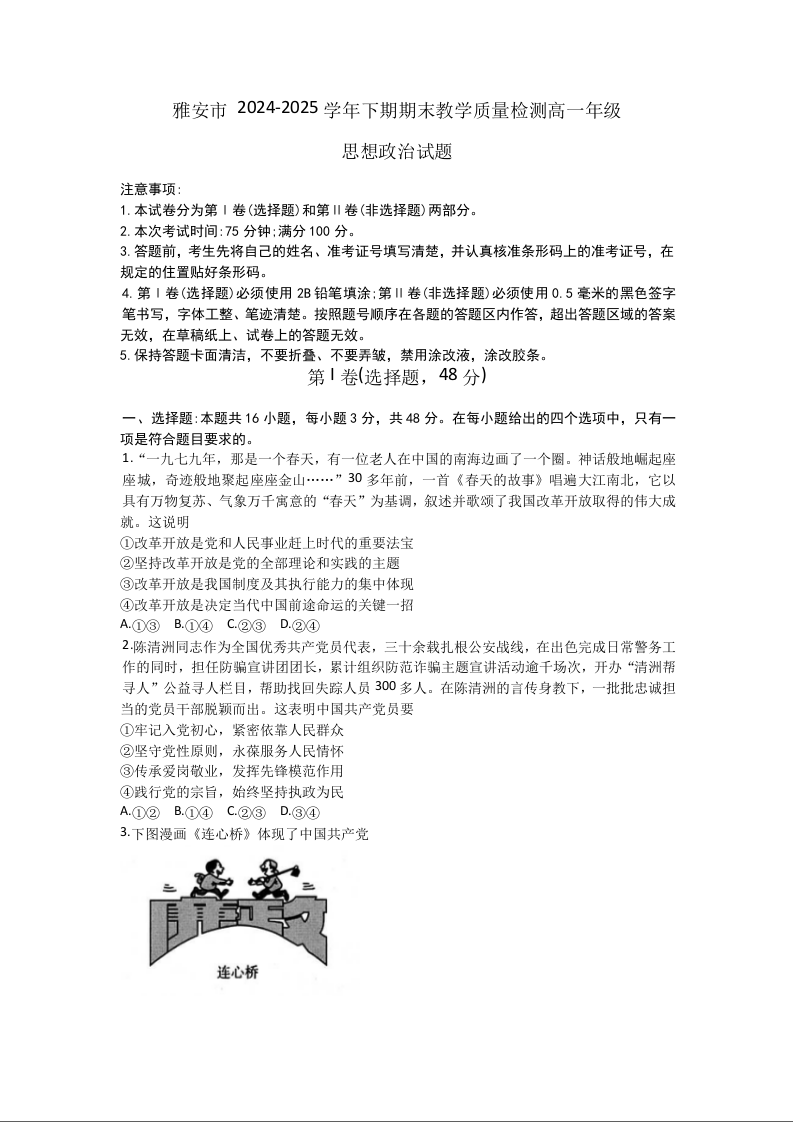 高一政治--四川省资阳市2024-2025学年高一下学期期末质量监测
