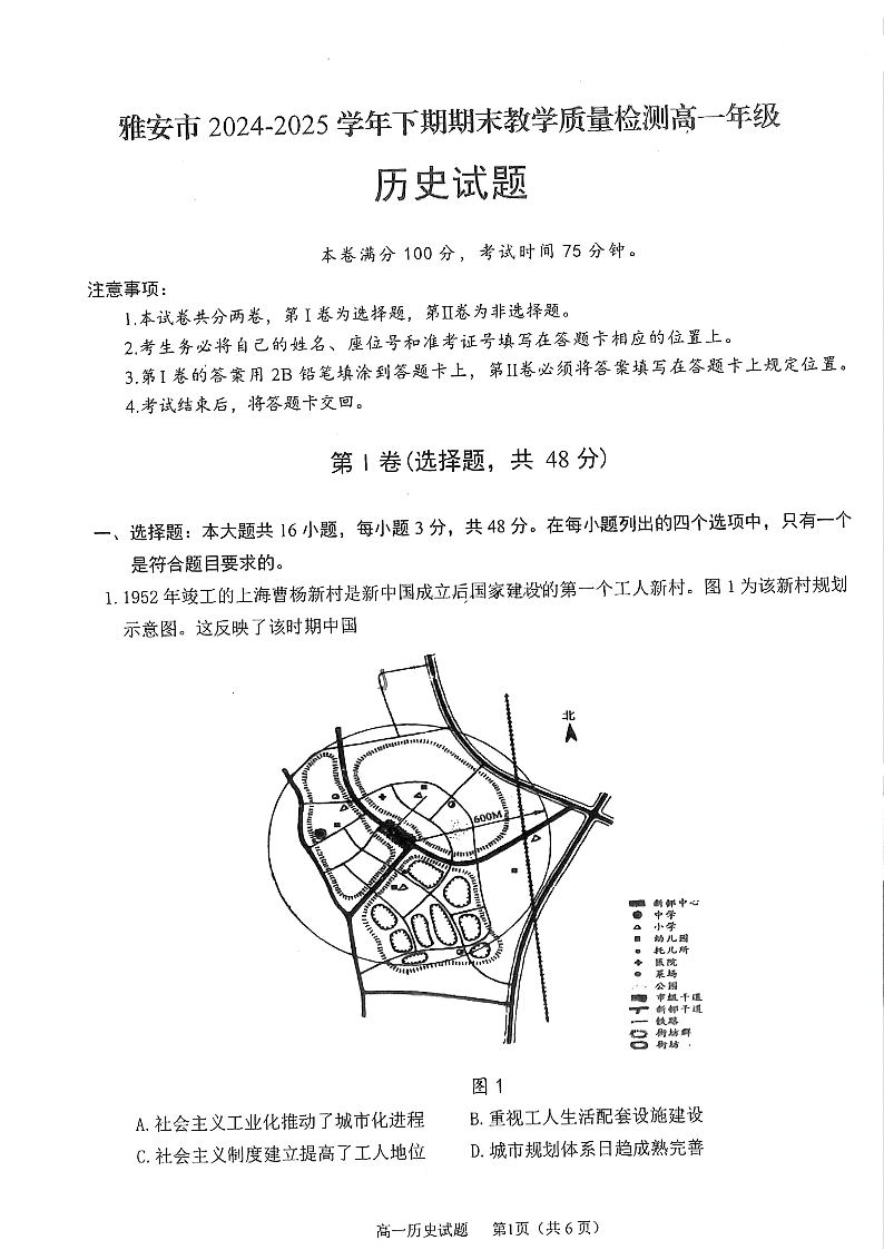 高一历史+答案--四川省雅安市2024-2025学年高一下学期期末教学质量检测试卷