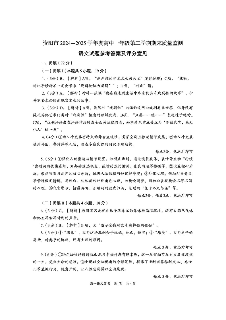 高一语文答案--四川省资阳市2024-2025学年高一下学期期末质量监测