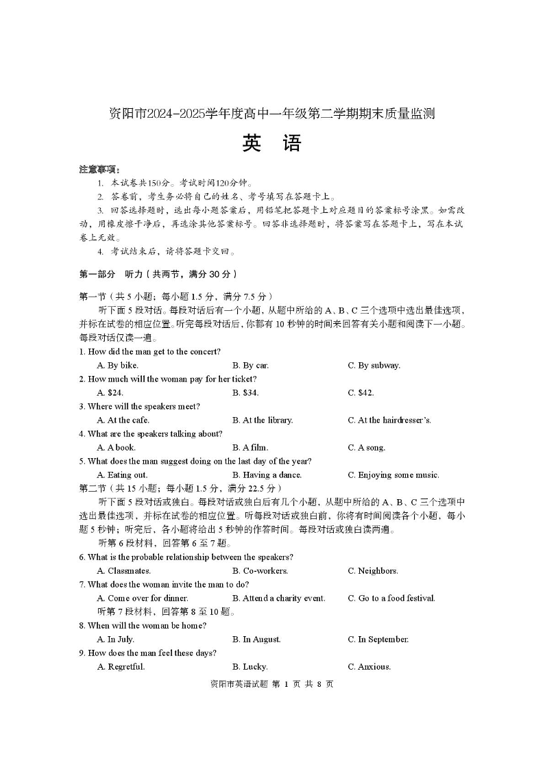 高一英语+答案--四川省资阳市2024-2025学年高一下学期期末质量监测