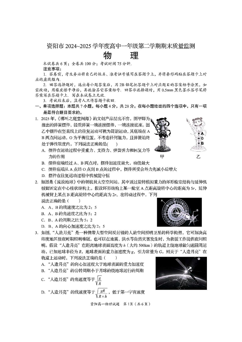 高一物理+答案--四川省资阳市2024-2025学年高一下学期期末质量监测