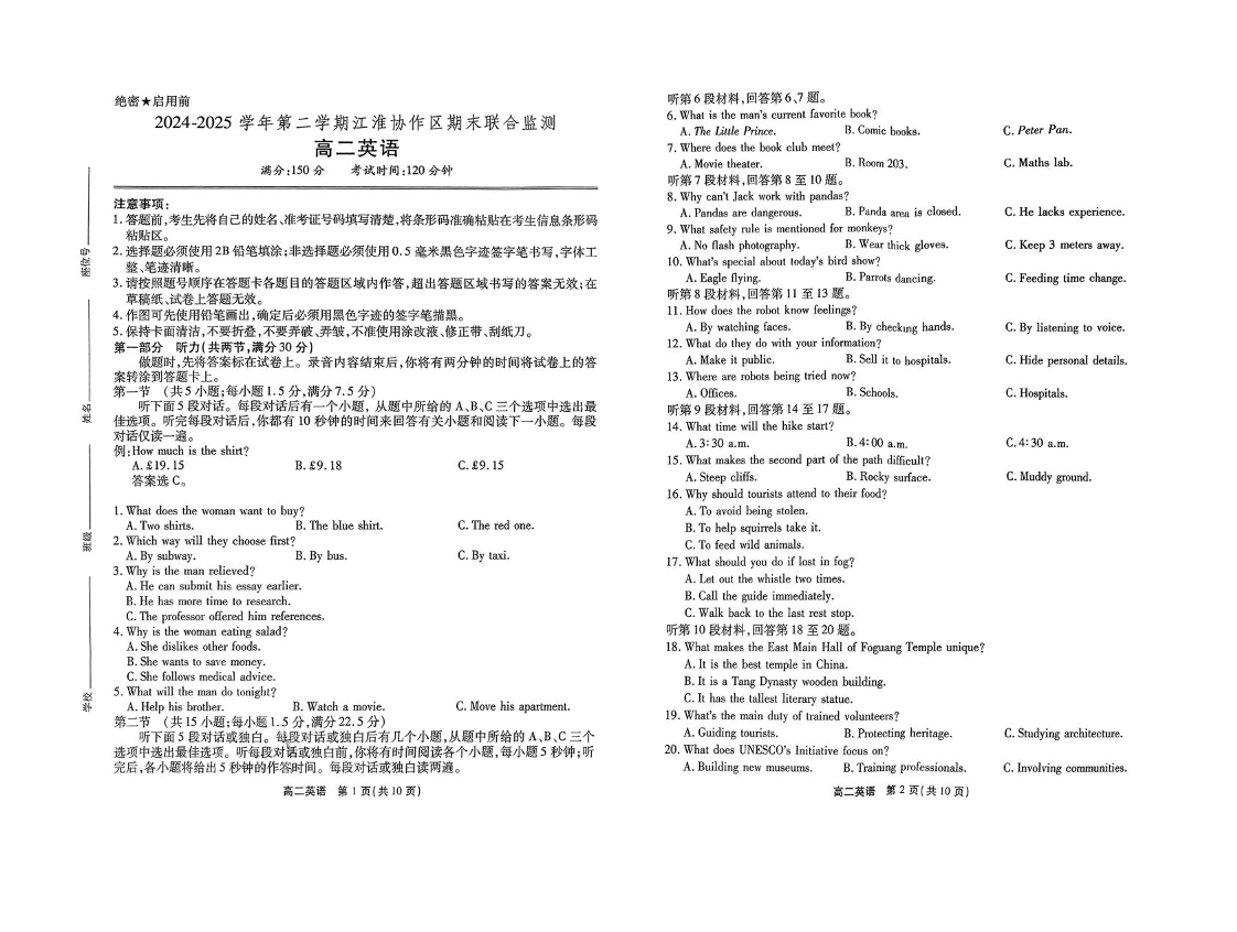 高二英语+答案--安徽省江淮协作区2024-2025学年高二下学期期末联合监测