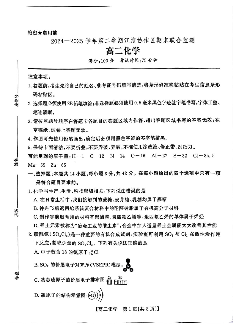 高二化学+答案--安徽省江淮协作区2024-2025学年高二下学期期末联合监测
