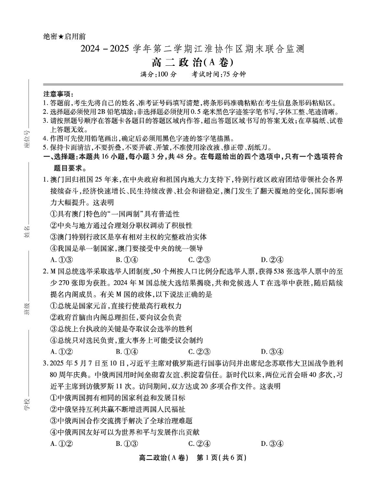 高二政治A卷+答案--安徽省江淮协作区2024-2025学年高二下学期期末联合监测