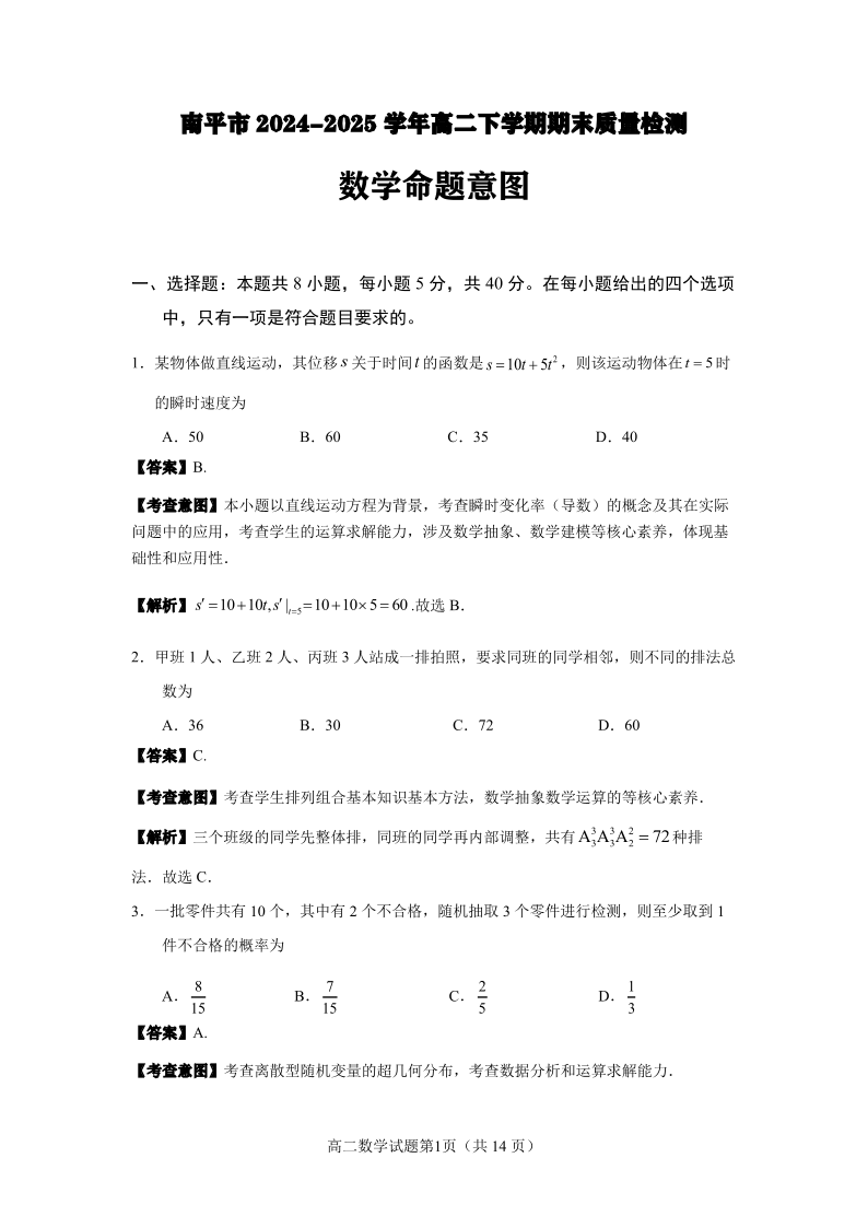 高二数学解析版--福建省南平市2024-2025学年第二学期高二下期末质量检测试卷