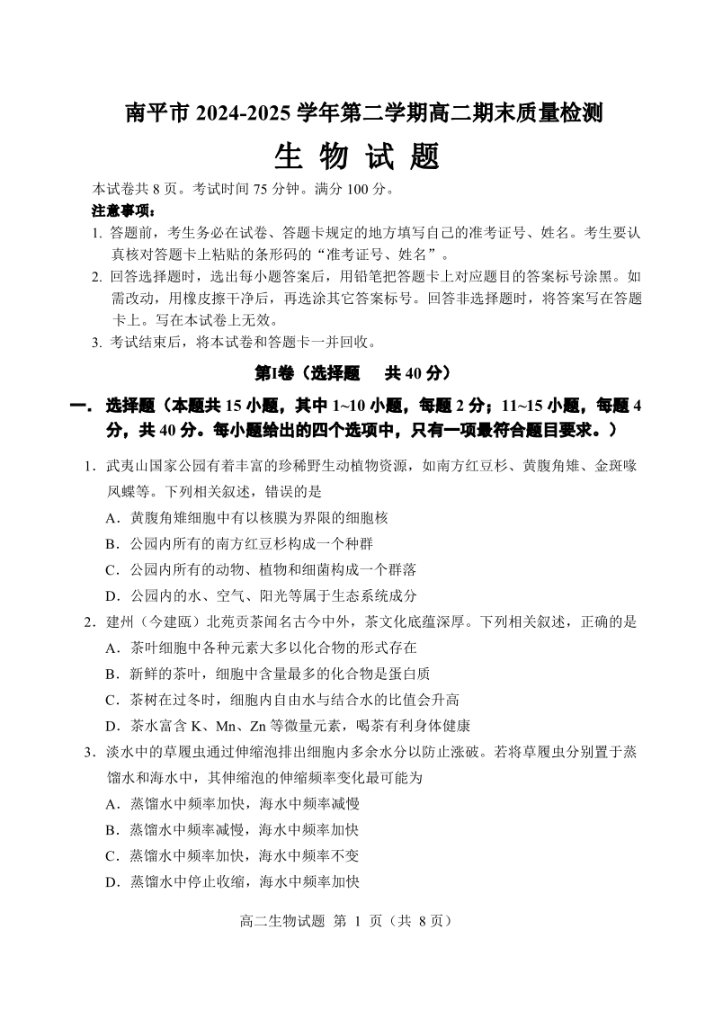 高二生物+答案--福建省南平市2024-2025学年第二学期高二下期末质量检测试卷