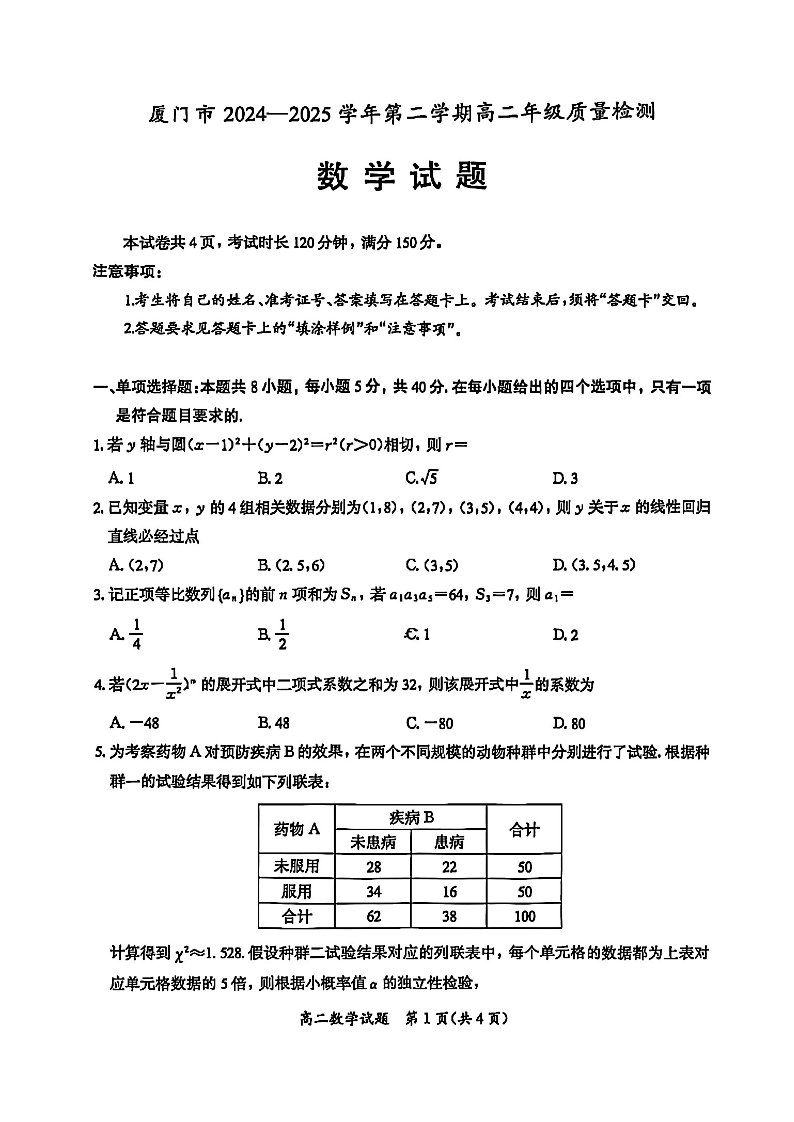 高二数学+答案--福建省厦门市2024-2025学年高二下学期期末质量检测