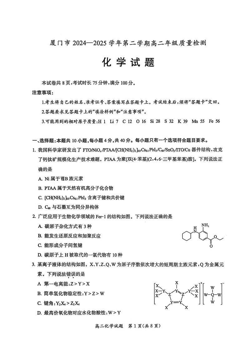 高二化学+答案--福建省厦门市2024-2025学年高二下学期期末质量检测