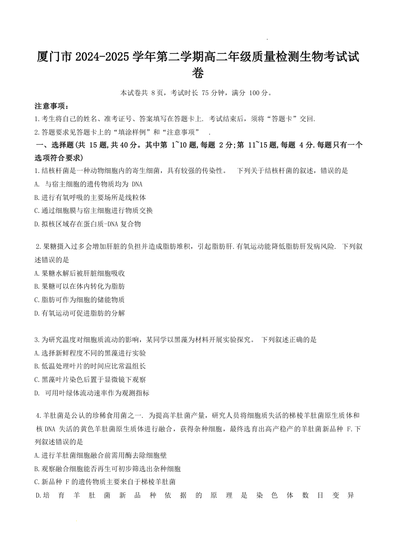 高二生物--福建省厦门市2024-2025学年高二下学期期末质量检测
