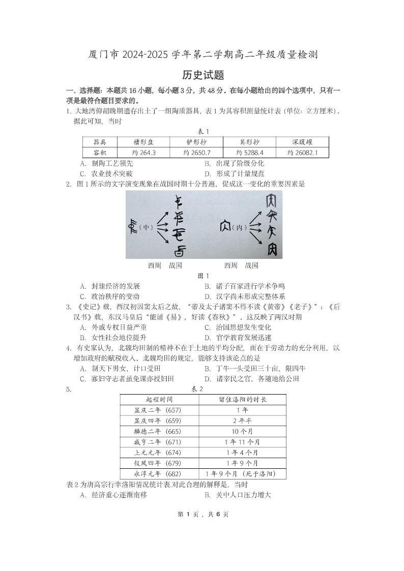 高二历史+答案--福建省厦门市2024-2025学年高二下学期期末质量检测
