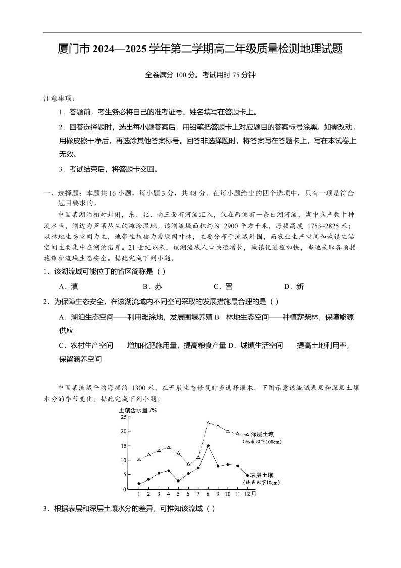 高二地理原卷版--福建省厦门市2024-2025学年高二下学期期末质量检测