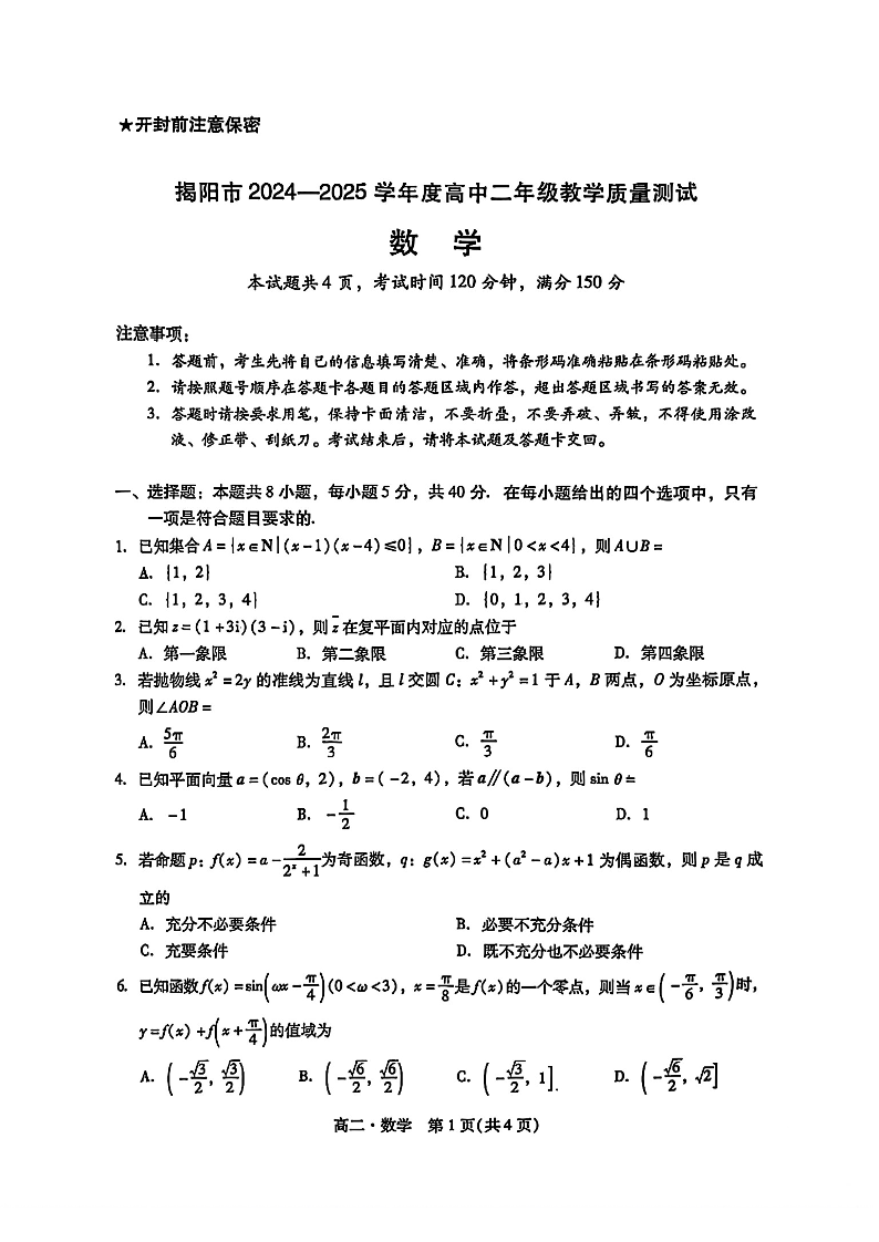 高二数学+答案--广东省揭阳市2024-2025学年高二下学期期末教学质量测试