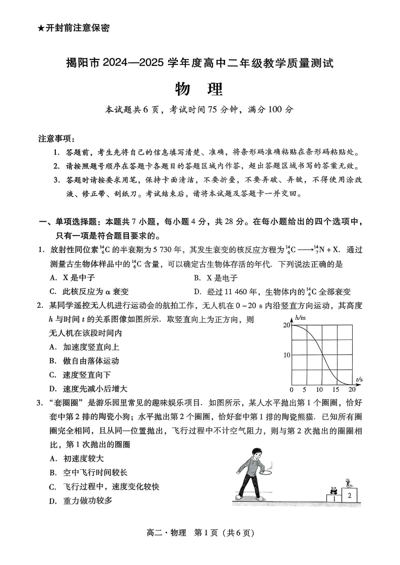 高二物理+答案--广东省揭阳市2024-2025学年高二下学期期末教学质量测试