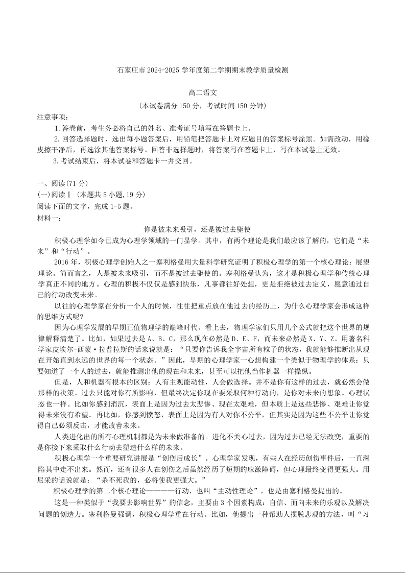 高二语文+答案--河北省石家庄市2024-2025学年高二下学期期末教学质量检测