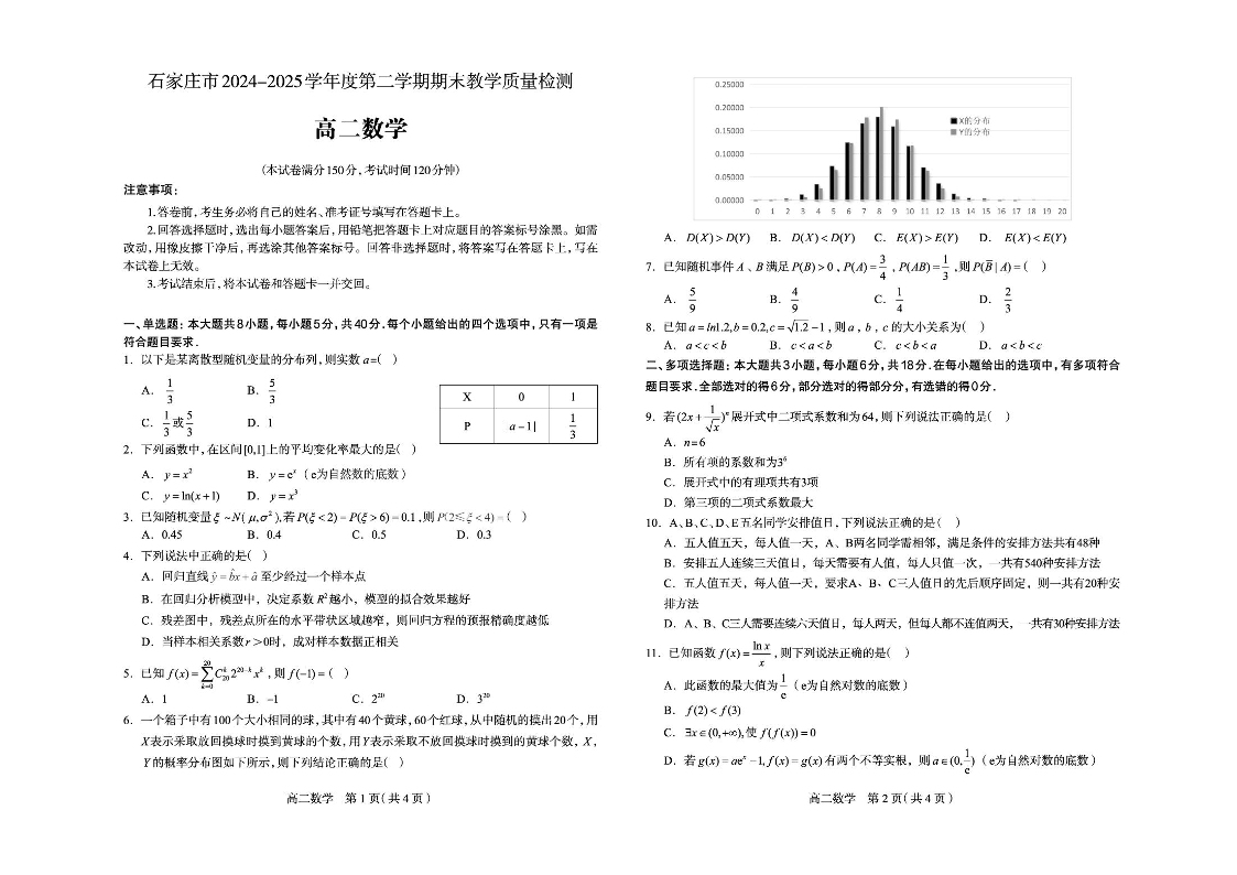 高二数学+答案--河北省石家庄市2024-2025学年高二下学期期末教学质量检测