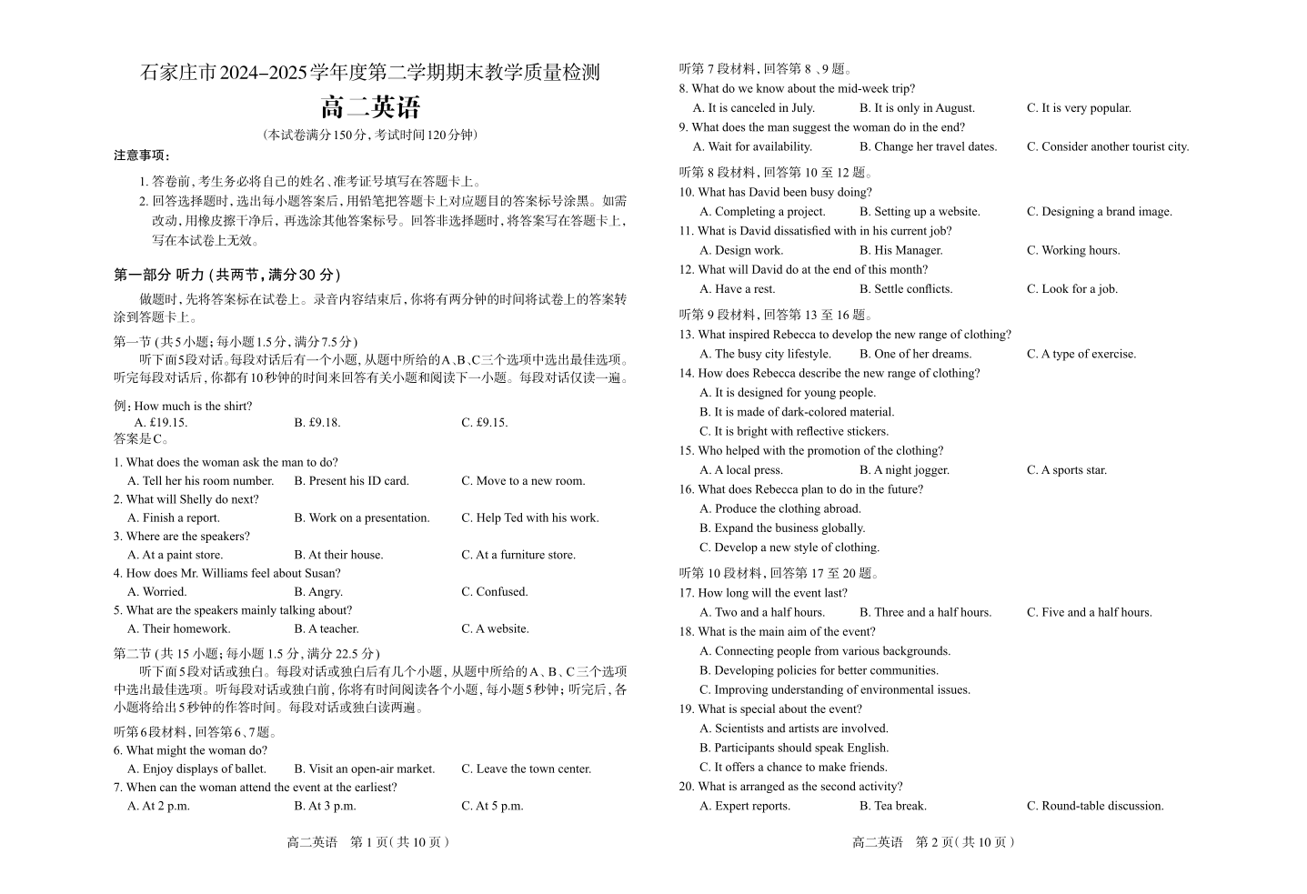 高二英语+答案--河北省石家庄市2024-2025学年高二下学期期末教学质量检测