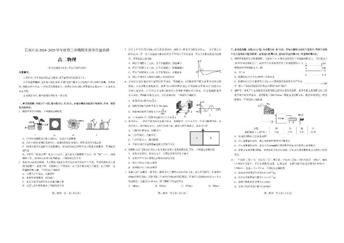 高二物理+答案--河北省石家庄市2024-2025学年高二下学期期末教学质量检测