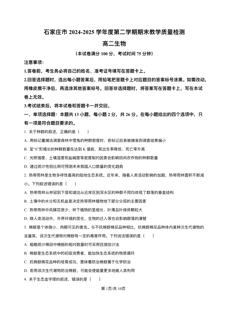 高二生物+答案--河北省石家庄市2024-2025学年高二下学期期末教学质量检测