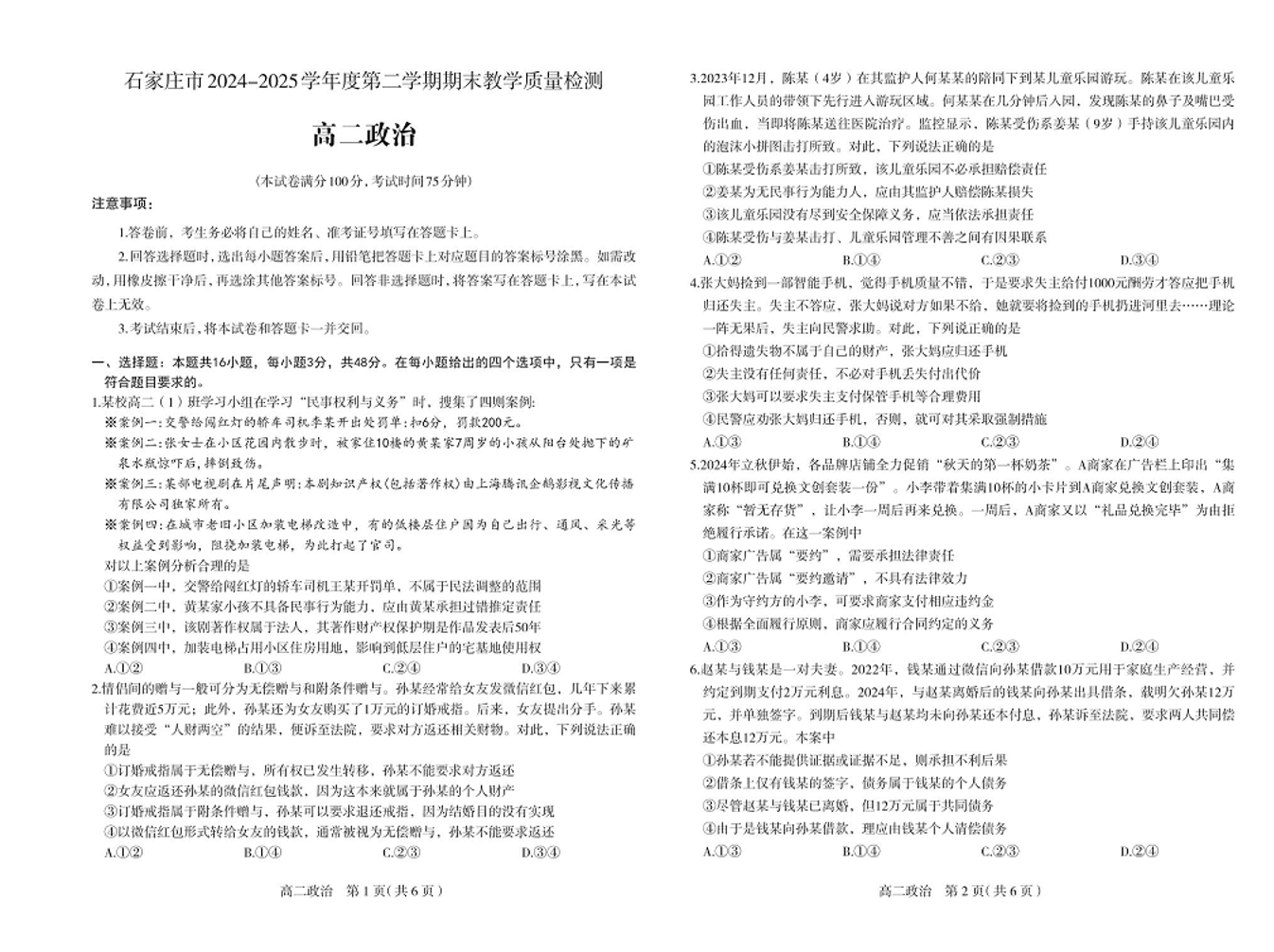 高二政治+答案--河北省石家庄市2024-2025学年高二下学期期末教学质量检测
