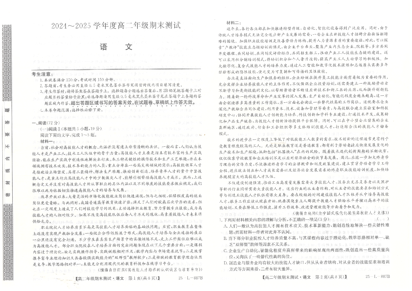 高二语文--河北卓越联盟2024-2025学年度高二年级期末测试